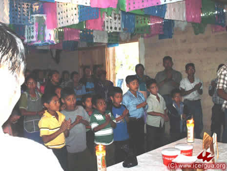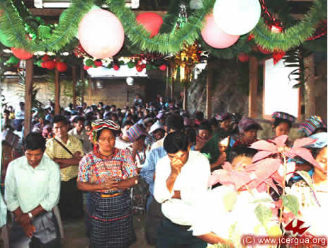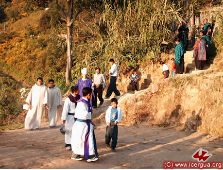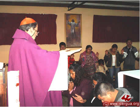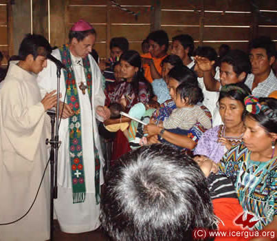 El 17 de Diciembre tuvieron el primer contacto con ICERGUA los representantes de una Comunidad de los Guates, San Juan Sacatepéquez, a la cual, por su compromiso espiritual, le había sido negada la administración de los sacramentos. Está formada por unos 300 adulto y, con jóvenes y niños, llega a unos 1000 miembros. El obispo llegó a visitarles el martes 23 por la noche para dialogar con toda la comunidad y el 25 de Diciembre se celebró una solemne misa. Era la primera Eucaristía que tenían en casi cuatro años. Las lágrimas de gozo se entremezclaban con el entusiasmo que irradiaban los rostros de los hermanos, al ver que el Señor había escuchado su clamor y que les enviaba aquello por lo que tanto habían sufrido y orado. Para el 11 de enero se tiene planificada la celebración de bautismos y la institución de ministros de la comunión, para que puedan tener permanentemente la presencia del Santísimo Sacramento. |