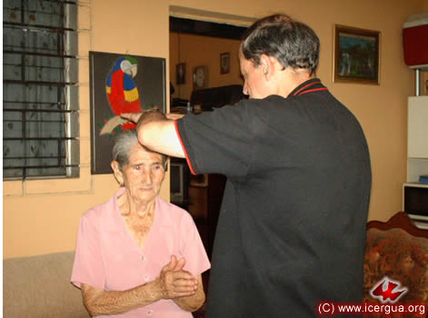 Arriba: La visita comenzó por Izalco. La abuelita de Marco Tulio quiso encontrarse con nuestro obispo para hacer su confesión, recibir la extrema unción y la comunión. En la foto, momento en que Monseñor Eduardo invoca el Espíritu Santo, para pedir que, por la unción con el óleo de los enfermos, la hermana fuera robustecida en su fe y en su cuerpo y pudiera vivir con gozo y fortaleza su ancianidad. |