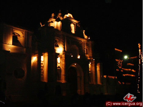 A la izquierda: una vista de la iglesia colonial, hermosamente iluminada y del árbol navideño que fue construido en el atrio. La foto fue tomada al regreso de la posada.