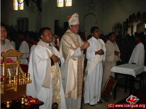 Arriba: Entrada para la celebración de la misa. De izquierda a derecha: seminarista José Hernández, Padre Rigoberto Upún, Monseñor Eduardo, Diácono Denis Obando y seminarista Mauricio Siriboy.