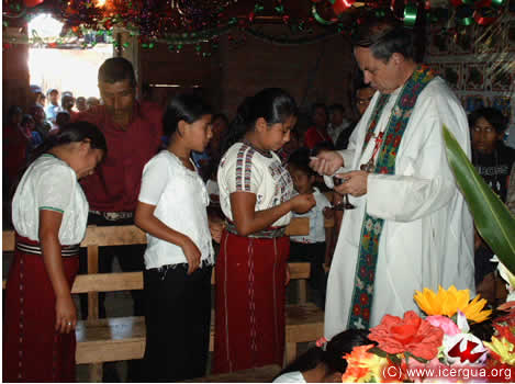 Hacia el medio día monseñor Eduardo celebró la Eucaristía con la comunidad de la finca La Perla de Chajul, el Quiché. Durante la misa un buen número de niños hicieron la primera comunión. |