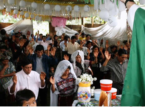 A la izquierda: después de la celebración de los matrimonios, tanto los padres como los padrinas oran sobre los que han contraído matrimonio. El segundo a la izquierda es el Hermano Jacinto, quien además de ser padrino de uno de los matrimonios, es el líder y fundador de la comunidad.