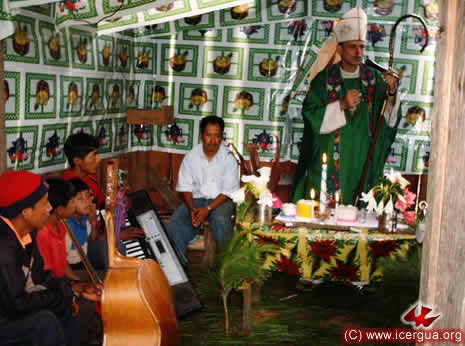 A la derecha, en presencia del Santísimo Sacramento, las autoridades indígenas y el Obispo.