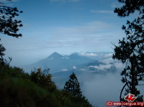 Arriba: Una hermosa vista de los volcanes Atitlán, Tolimán, San Pedro, Santo Tomás o Pecul, Zunil y Santa María, tomada poco antes de conquistar la primera cima, es decir la del pico Yepocapa.