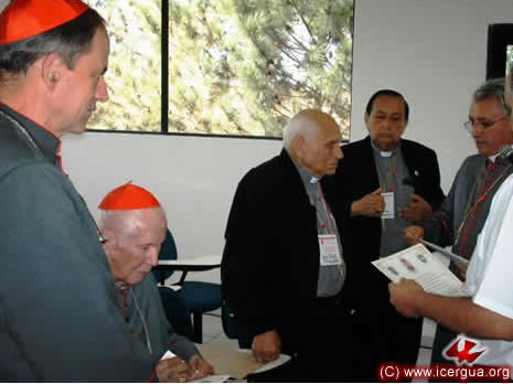 A la derecha: Dom Wagner, nuestro Obispo, Mons. Eduardo y Dom Wagner, Obispo de Sao Paulo, Canciller de ICAB y Vice-Presidente del Consejo de Honor de CICAM, cuando se dirigen al Plano de la Asamble Conciliar de ICAB. Durante la misma, los Obispos miembros de ICAB ratificaron su aceptación de los Estatutos de CICAM. |