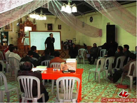 El sábado 11 por la mañana, por invitación de la Directiva de los Catequistas de la Catedral de San Juan Comalapa, el obispo dirigió un seminario de formación para líderes. Asistieron unos 300 hermanos. La primera temática desarrollada giró en torno a las características del líder, de acuerdo al Nuevo Tes-tamento y al compromiso asumido por nuestra iglesia. La segunda temática trató sobre las consecuen-cias eclesiológicas, organizativas y pastorales de nuestra visión de los ministerios. |