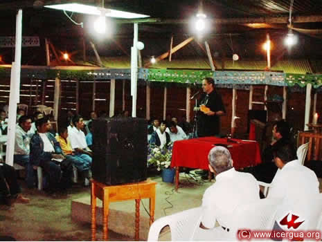 Arriba: Al fondo está el "baner", que representa a los Mártires de Chajul. Enfrente se puede obsdervar a algunos de los componentes del ministerio.