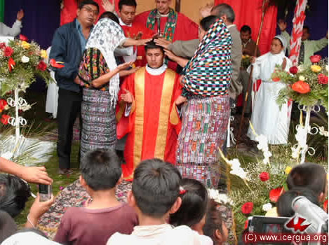 Dos hermanos de Soloma representaron a los padres de Luís Felipe y dos hermanos de Santa Eulalia fueron escogidos como padrinos. Al terminar la ordenación, ellos oran sobre el nuevo diácono. En el fondo a la derecha está el Padre Fredi Mux, encargado del Decanado del Centro de Huehue-tenango y quien ha acompañado a Luís Felipe en su Ejercicio Pastoral Supervisado. |