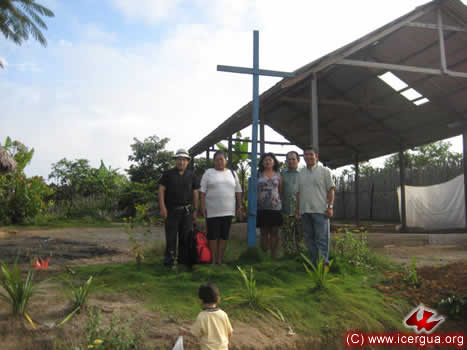A la derecha: Los padres con algunos de los feligreses, junto a la cruz de la misión. En el fondo, el techo del hermoso templo que está en construcción.