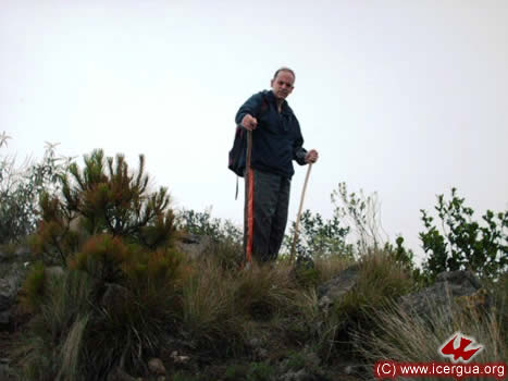 Al lado: el obispo depués de llegar a la cima del volcán Zunil.