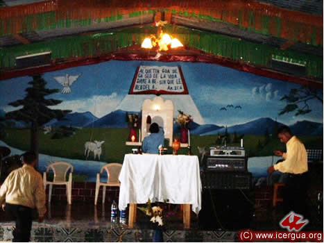 En la pared del fondo se puede observar una foto con el proyecto del nuevo templo que la comunidad ha iniciado a construir. Los hermanos esperan que pronto el proyecto llegue a hacerse plena realidad.