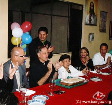 A la derecha: Cantando el "Feliz cumpleaños". Podemos ver en la foto, de izquierda a derecha: Gerardo Aguirre, hermano del obispo, Monseñor Eduardo, el Padre Juan Moisés, Doña Anna, mamá de Monseñor y sus hermanos: Ileana y Federico.