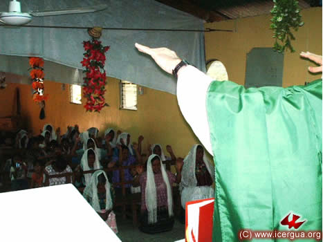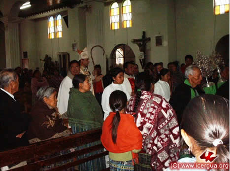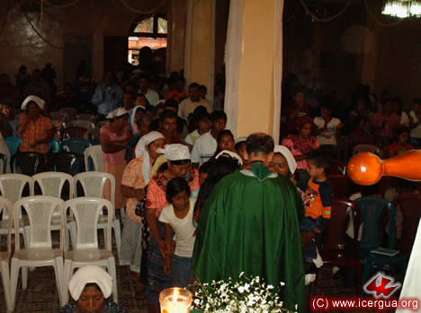 A la derecha: Un momento durante la Homilía. Tanto las lecturas como la homilía fueron pronunciadas tanto en castellano como en Kakchiquel, el idioma propio de los feligreses.
