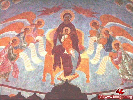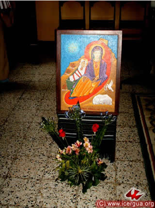 A la derecha: foto del icono de la Madre de Dios, que se encuentra en e ábside del templo.