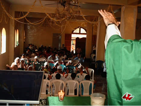 Cuando las clases terminan, como se puede observar en la foto a la izquierda, el obispo celebra la Eucaristía con los participantes. De esta forma, el crecimiento en los conocimientos teológicos, va a compañado por el fortalecimiento espiritual. |