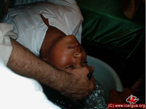 A la derecha: Momento de la efusión del agua con imposición de las manos, durante el bautismo, simbolizando la efusión del Espíritu Santo que es dada por la Trinidad Santa, al administrar el sacramen-to.