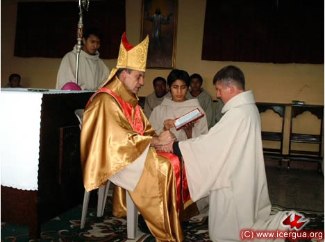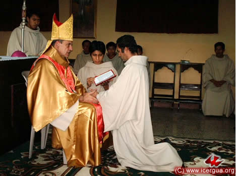 Después de hacer el compromiso de incorporación y de celibato, quienes serán ordenados se postran, mientras todo el pueblo de Dios, de rodillas, cantan las letanías. Al final de éstas, el obispo invoca sobre los que serán ordenados, la efusión del Espíritu Santo. Esto es lo que se puede observar en la foto de la derecha. |