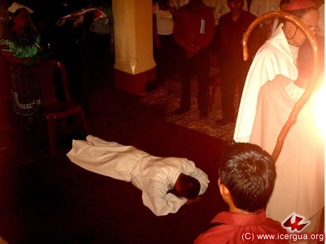 A la izquierda: José Armando está postrado, en señal de su total entrega y sumisión a Dios, mientras el coro canta la letanía de los santos, implorando la efusión del Espíritu Santo. |