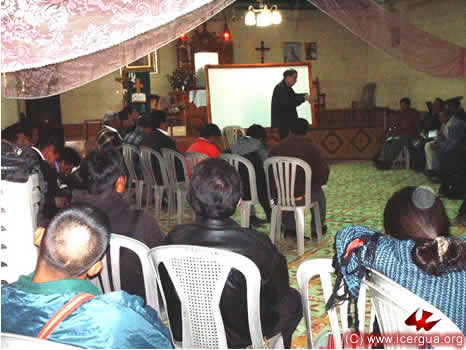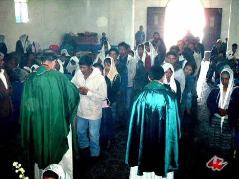 A la Derecha: Los padres Luís Felipe Corimanya y Fredi Mux, participando junto a los demás hermanos en la reunión. Ésta se lleva a cabo en la Iglesia de San Miguelito, en la parte alta de Santa Eulalia.