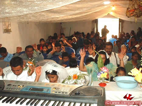 A la derecha: momento de oración durante la celebración, en la cual, se realizó un matrimonio y se administro la iniciación cristiana a numerosos niños, incluidos los hijos de la pareja que contrajo matrimo-nio.