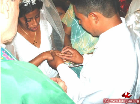 A la izquierda: Cirilo y Catarina, después de haber expresado su mutuo consentimiento, se imponen el anillo y comparten los bienes, como prenda de la fidelidad, el cuidado y el amor que tendrá uno hacia el otro. |