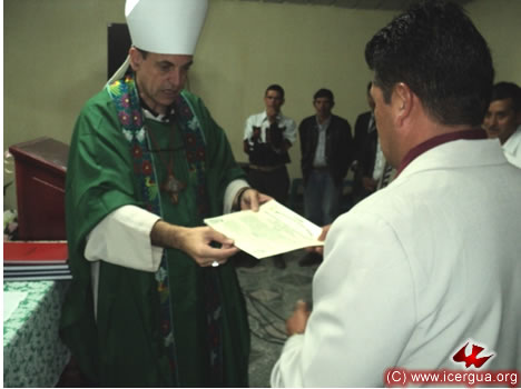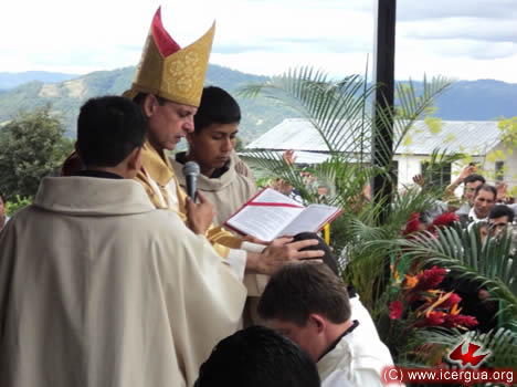 Aunque el día específico del aniversario de ICERGUA es el día 27 de Octubre, en el que se conmemora el haber sido constituidos como Iglesia local, al haber recibido la Sucesión Apostó-lica, por razones prácticas el aniversario fue trasladado para el día 29. Se realizó, como se está volviendo tradición, en el Centro de Formación de Huehuetenango. A pesar de las dificultades de transporte, se contó con la presencia de más de 5000 hermanos, provenientes en su ma-yoría de las áreas vecinas, aunque contanto con representantes de todas las parroquias y reguiones. El punto culminante de la celebración lo marcó la ordenación de cuatro diáconos como presbíteros. |