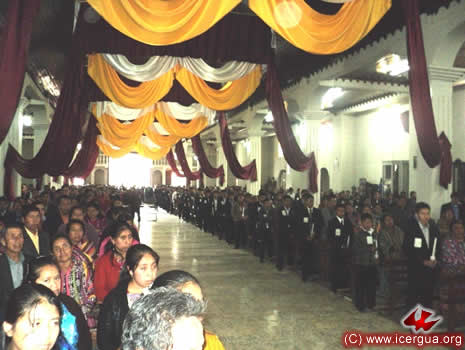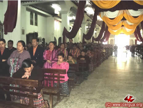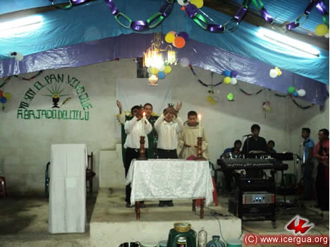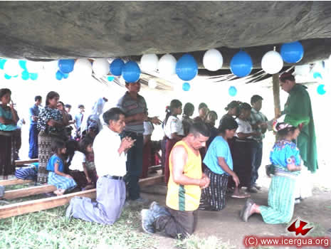 Con ocasión de la celebración unos ciento cincuenta ministros de la parroquia de la Glorificación de María, de Santa Cruz Barillas, hicieron la renovación anual de sus compromisos. A la derecha se puede observar uno de los momentos en los que los ministros están sumidos en profunda oración. |