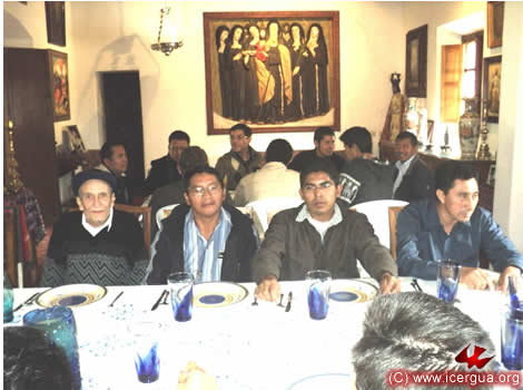 A la derecha: una vista de algunos de los presbíteros participantes, durante el almuerzo. En primera plana: P. Ricardo Sáenz, el anfitrión, PP. Bernabé Mateo, Denis Obando y Santos Acosta. En la mesa del fondo: de izquierda a derecha: PP Fredy González, Rigobertu Upún, Marco Tulio Calderón, Fredi Mux, Juan Moisés Mendoza, Luís Felipe Corimanya y Pedro Martínez.