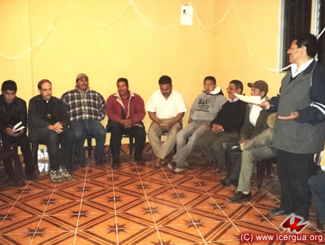 A la derecha: el obispo da la forma-ción a los representantes de las comunidades. Frente al obispo, a la izquierda, se encuentra el Padre Bernabé. A la derecha del obispo está el Padre Denis, quien ha esta-do ejerciendo su ministerio, primero como diácono y actualmen-te como presbítero entre los hermanos de Uspantán.