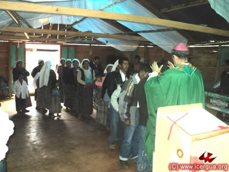 Hacia el medio día, el obispo presidió la celebración de la Eucaris-tía en la Aldea Pojom. La visita abarcó dos etapas: durante la celebración de la misa, un numeroso grupo de jóvenes, diligentemente preparado, recibidó el sacramento de la confirmación. Luego se celebró la bendición del nuevo templo, que está en proceso de ser terminado. |