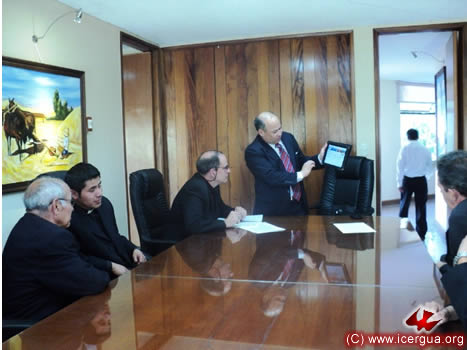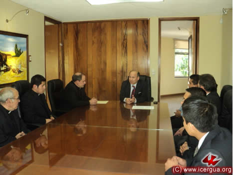 Arriba: Diálogo que se estableció entre el Rector de la Universidad, Doctor Fidel Reyes Lee y el Decano de la Facultad de Derecho y Asesor Jurídico de la Universidad, Licenciado Mario García, con nuestro obispo y los miembros del equipo de formación y algunos estudiantes presentes.