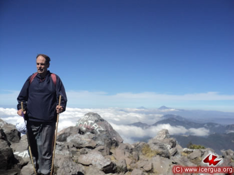 El domingo seis, el obispo hizo una peregrinación a la cima del Volcan Santa María, en el departamento de Quetzaltenango. El clima y el panorama eran insuperables. En la foto de la izquierda, el obispo después de haber finalizado la escalada. Al fondo pueden observarse los volcanes Tajumulco y Tacaná. |