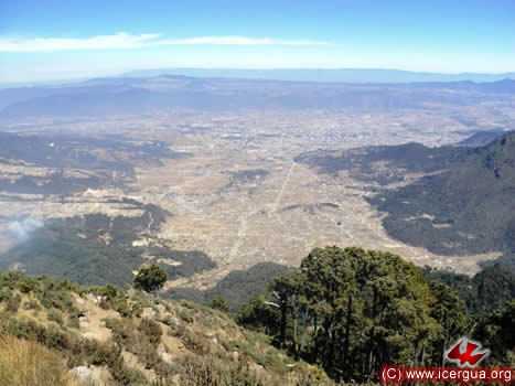 En la foto de la izquierda: una vista panorámica hermosa de los Llanos del Pinal y de todo el Valle de Quetzaltenango, desde la cima del Santa María. En el fondo pueden observarse los Cuchumatanes. |