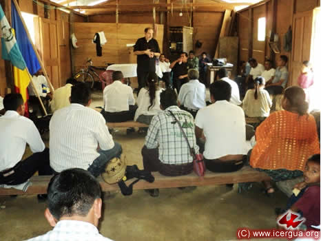 El veinticuatro, Monseñor Eduardo comenzó su visita por el norte del país, con la reunión del Decanato de Cobán. Se contó con la presencia de muchos hermanos. Cada representante de un centro pastoral dio un informe de la marcha de los trabajos. Al final, antes de que el Obispo comenzara a informar sobre la marcha general de la Iglesia y diera la formación prevista, los dos presbíteros que trabajan en la zona: los padres José Angel Núñez y Fredy González, dieron un informe detallado de la marcha de las zonas pastorales. En la foto de la izquierda, el Padre José Angel mientra rinde su informe. |