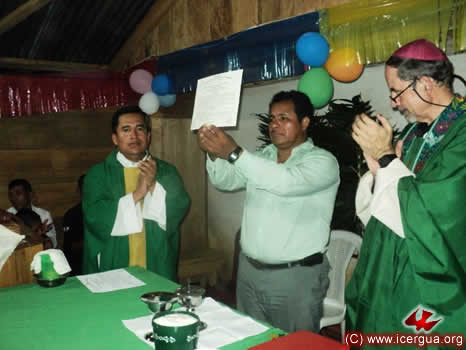 El responsable pastoral de la nueva parroquia será también el Padre Fredy Gozález. En la foto de la derecha, momento en el que el obispo hace lectura del decreto de creación de la parroquia. |