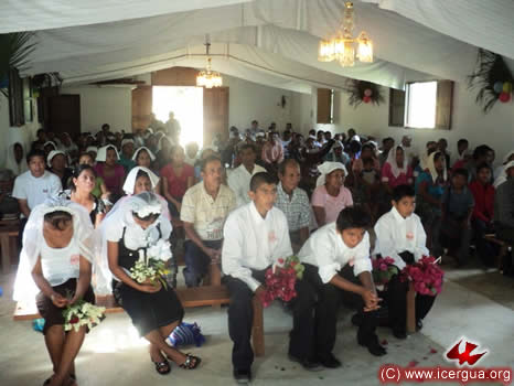 Por la tarde Monseñor Eduardo celebró la Eucaristía en la Comunidad de Quiejolá, San Sebastián H. La sorpresa del obispo fue grande al observar el hermoso templo que están construyendo los hermanos. Hasta hace pocos meses contaba con un pequeño templo de adobe. Ahora han terminado la construcción de la fachada, las paredes interiores y el techo de un templo espacioso y hermoso. Es signo del compromiso que tienen los hermanos de cumplir fielmente la misión que el Señor nos ha confiado. |