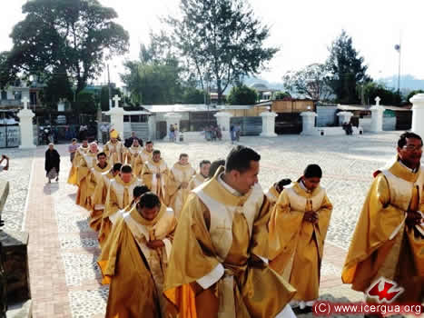 A las cuatro de la tarde, dio inicio la Misa Crismal. Todo el presbiterio se revistió en la Iglesia Colonial y luego salió en procesión hacia la Catedral, atravesando por la Hermosa Plaza de San Juan Bautista, que fue inaugurada recientemente. En la foto de la izquierda se puede observar cómo se procede hacia la Catedral e, igualmente se observa la magnitud y hermosura de la Plaza. La misma será concluida cuando, con ocasión de la Fiesta de San Juan Bautisma, sea inaugurada una estatua de bronce, de más de dos metros de altura, que será colocada en el pedestal que se puede observar en el extremo derecho de la foto del lado. |
