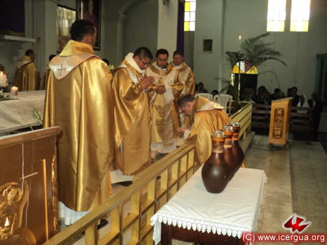 Después de la homilía, los Padres Juan Moisés, Santos y Marcos, trajeron en procesión las ánforas conteniendo el óleo que sería bendecido o consagrado, según fuera el caso. En la foto de la derecha, se observa al obispo, mientras se prepara para recibir de los presbíteros las ánforas. |