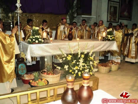 Con un sencillo incensario de bajo, que los hermanos han traído de Guatemala, el obispo hace la incensasión sobre las ofrendas. |