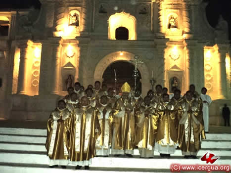 La celebración terminó cuando ya había entrado la noche. La procesión de salida concluyó en la iglesia colonial. En la foto de la derecha, el Presbiterio posa, teniendo como fondo la imponente iglesia colonial, hermosamente iluminada.