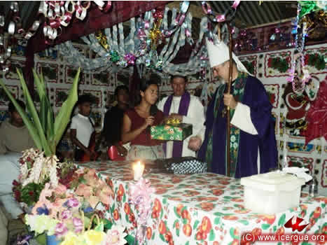 A la derecha: el obispo, despues de realizar el bautismo de unos de los niños, lo entrega a sus padres diciéndoles: "Reciban a Juan, que ahora ha sido constituido en hijo de Dios y miembro de su iglesia". |