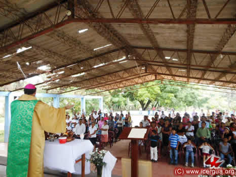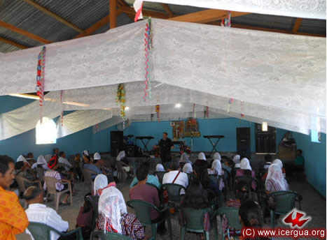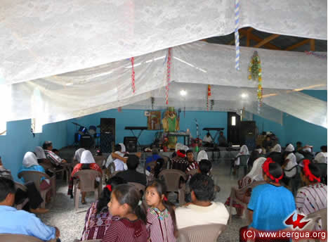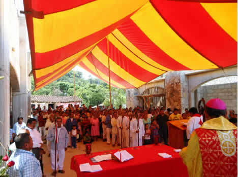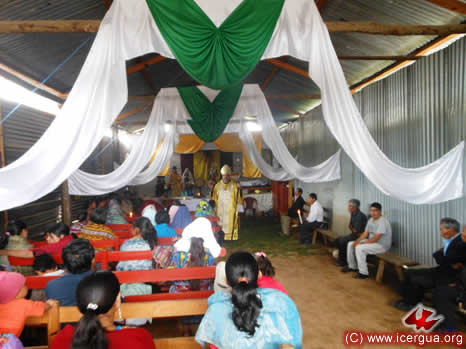 Los hermanos estaban llenos de alegría, porque después de varios años de esfuerzos, han logrado levantar las paredes y colocar el techo de su nuevo templo. Aún les falta terminar la construcción pero, por el momento, ya tienen el espacio adecuado para poder celebrar la Eucaristía y para que la comunidad se reun a orar. |
