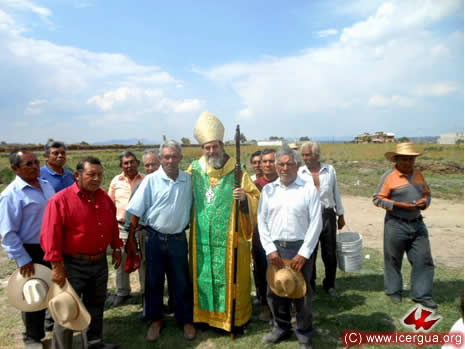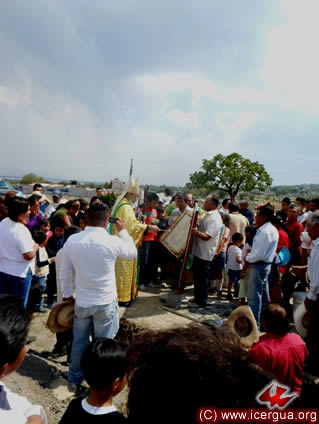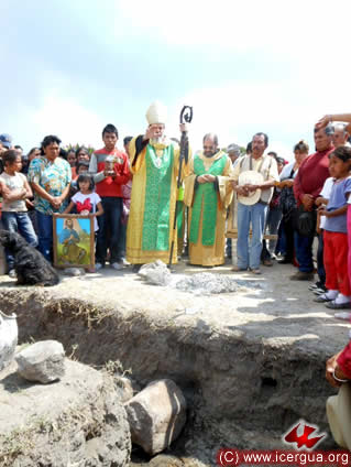 Terminada la celebrazión de la Eucaristía en Zumpango, el obispo procedió a la bendición de la primera piedra, en el lugar en el que será constuido el templo para la comunidad. |