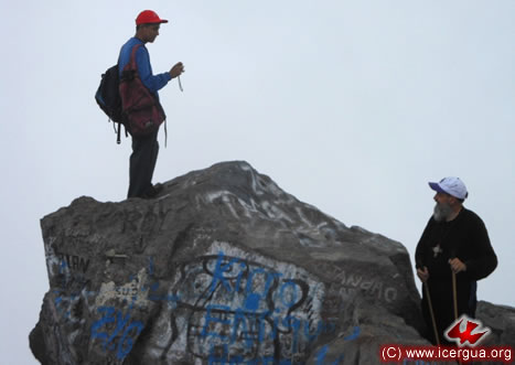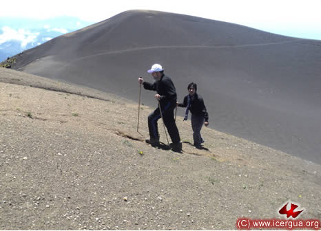 A la derecha: el obispo y el Padre Juan Moisés cuando se acercan a la cima del volcán.