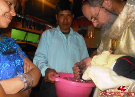 A la izquierda: momento del bautismo de uno de los niños que fue iniciado a la vida cristiana. |