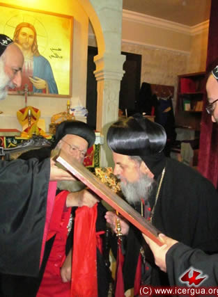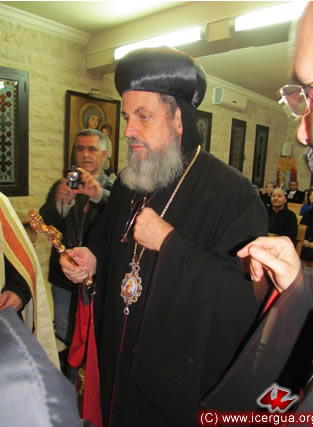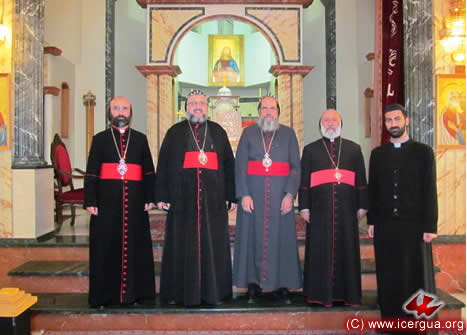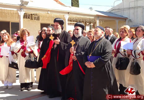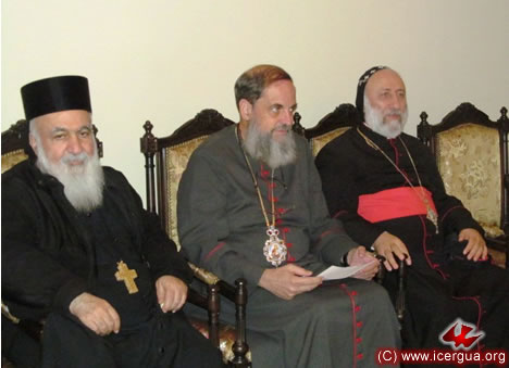 En la foto de la izquierda: El párroco de la Catedral, el representante de la Iglesia Católica Romana, el representante de los Muslmanes Shiítas, Mor Clemis Daniel, Mor Santiago Eduardo, el representante de los Musulmanes Drusos, Mor Clemis Eugenio, el representante de los Musulmanes Sunnis y Mor Crisóstomo Miguel.