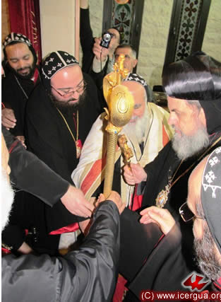 El primer paso establecido, fue el dar la tonsura monacal a nuestro obispo. Como es tradición, Su Santidad otorgó al obispo un nombre espiritual y eclesial: Yaqub, (Jacob), que en castellano se traduce como Santiago.