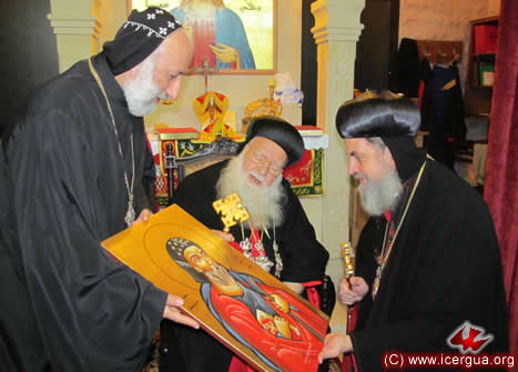 Finalmente Su Santidad entregó a nuestro Arzobispo un icono de Santiago Baradeo, pintado por una de las monjas del Monasterio de Atshaneh, Líbano, en donde reside temporalmente Su Santidad y que lleva el mismo nombre de Monasterio de Santiago Baradeo.