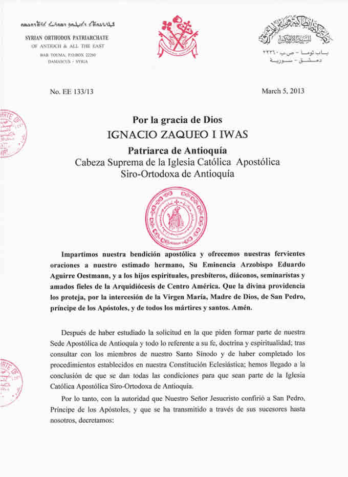 Su Santidad Mor Ignacio Zaqueo I, después de haber consultado con el Santo Sínodo, procedió a decretar la creación de la ARQUIDIÓCESIS DE CENTRO AMÉRICA, DE LA IGLESIA CATÓLICA APOSTÓLICO SIRO-ORTODOXA DE ANTIOQUÍA, la cual estará formada por la totalidad de miembros de nuestra Iglesia Católica Renovada.
