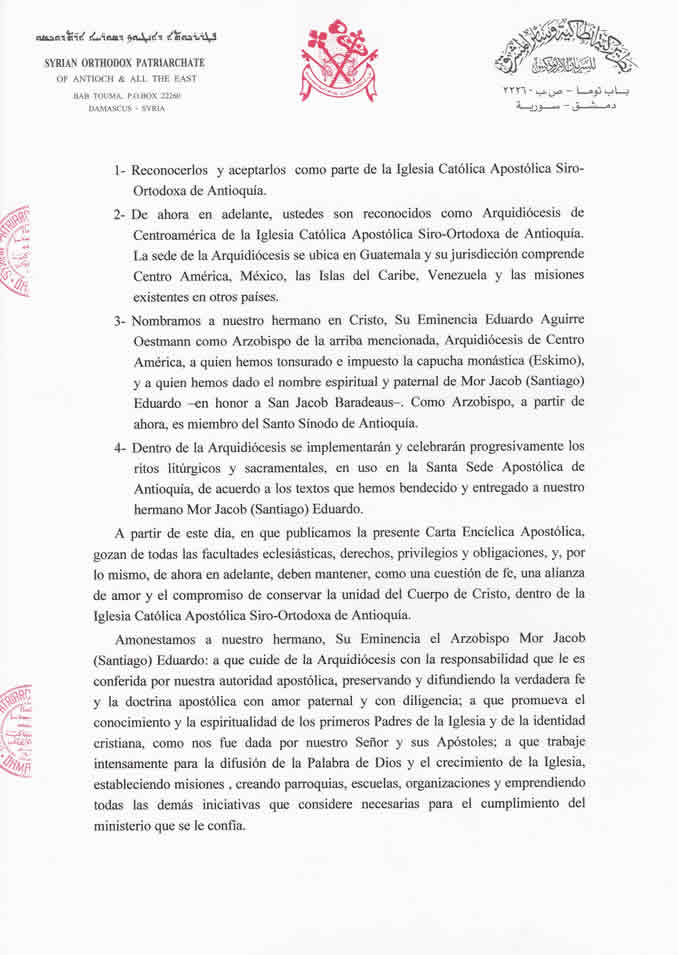 En la Encíclica consta lo siguiente: "Nombramos a nuestro hermano en Cristo, Su Eminencia Eduardo Aguirre Oestmann como Arzobispo de la arriba mencionada, Arquidiócesis de Centro América, a quien hemos tonsurado e impuesto la capucha monástica (Eskimo), y a quien hemos dado el nombre espiritual y paternal de Mor Jacob (Santiago) Eduardo –en honor a San Jacob Baradeaus–. Como Arzobispo, a partir de ahora, es miembro del Santo Sínodo de Antioquía."